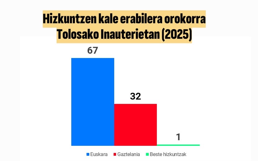 Euskara entzuten da gehien Tolosako inauterietan. Ondorio hori dakar Tolosako Udalak lehen aldiz inauterietan egindako behaketak. 2025eko inauterietan egin zuen neurketa: behatu zen kalean zebiltzan herritarrak zein hizkuntzatan ari ziren. Ondorioa argia da: hirutik bik euskaraz egiten dute kalean Tolosako inauterietan. Eta ondorio horren oinarrian badago joera oso argi bat: batez ere umeek eta gazteek ekartzen dute euskararen nagusitasun hori. Neurketaren emaitza nagusiak, bost gakotan: