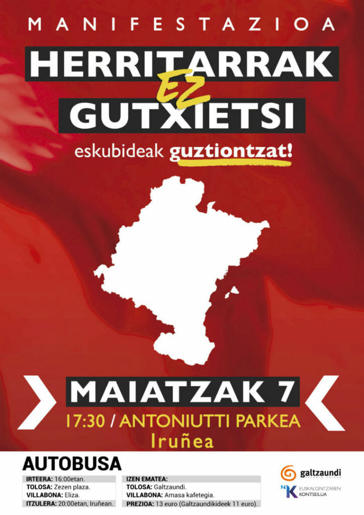 Horregatik guztiagatik, Galtzaundi Euskara Taldeak, Euskalgintzaren Kontseiluarekin bat eginez, maiatzaren 7an Iruñean egingo den manifestaziora joateko autobusak antolatu ditu. Autobusak arratsaldeko 16:00etan aterako dira Amasa-Villabonatik eta Tolosatik. Izena emateko epea maiatzaren 5era arte egongo da zabalik, eta honako lekuetan eman daiteke: